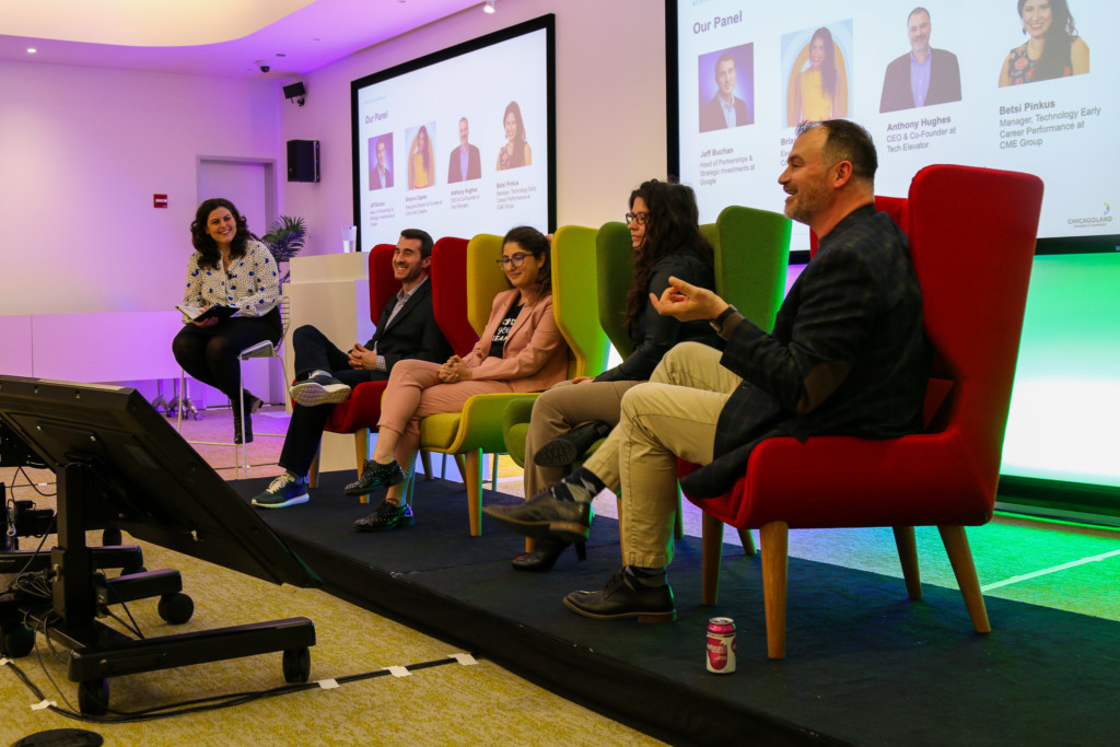 The panel, moderated by the new Chair of the Chamber’s Tech Council and Senior Vice President of Business Development at Cooley Alya Adamany Woods, featured Google’s Head of Global Partnerships and Strategic Investments Jeff Buchan, Executive Director & Founder of Code Your Dreams Brianne Caplan, Manager of Technology Talent at CME Group Betsi Pinkus, and Tech Elevator’s Co-Founder & CEO Anthony Hughes.