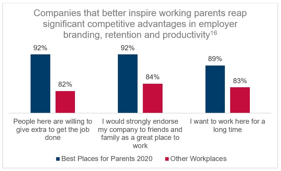 Creating an inclusive and supportive culture can help employees thrive and feel supported. For example, the working parent was one of the most impacted cohort groups this past year due to disruption in childcare and e-learning for school-aged kids. See the below graphic from Great Place to Work’s Annual Study of the Best Workplaces for Parents™ 2020 for company differentiator highlights.