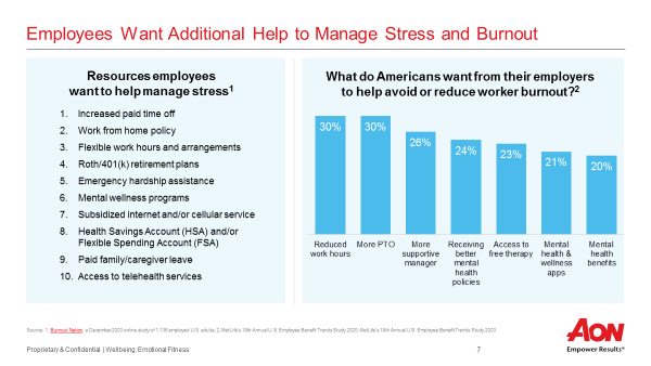 To learn more about how Wellbeing fits within Aon’s overall health survey findings and benchmarks, please consult our New Better Health Survey Results.